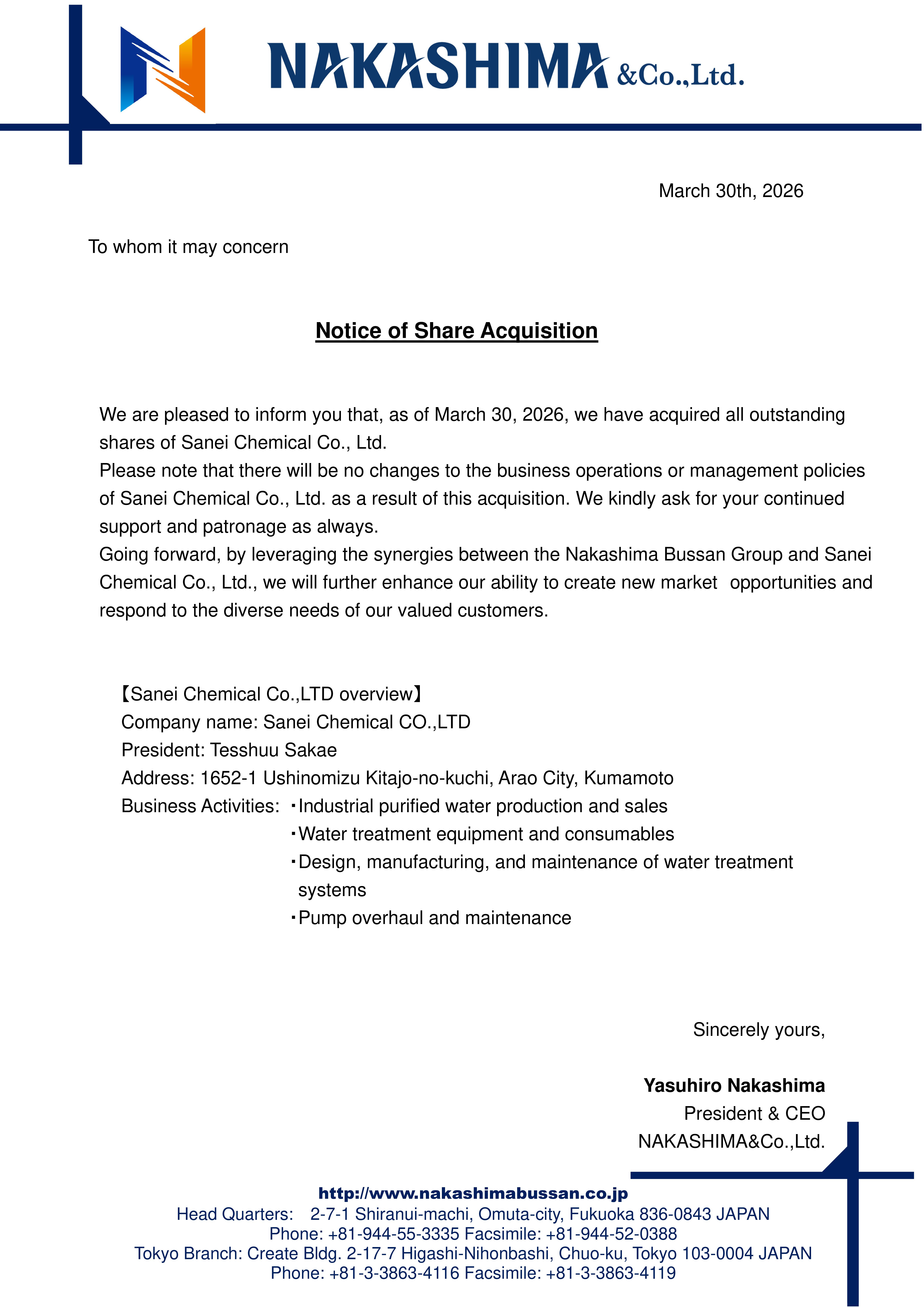 We are pleased to inform you that, as of March 30, 2026, we have acquired all outstanding shares of Sanei Chemical Co., Ltd.