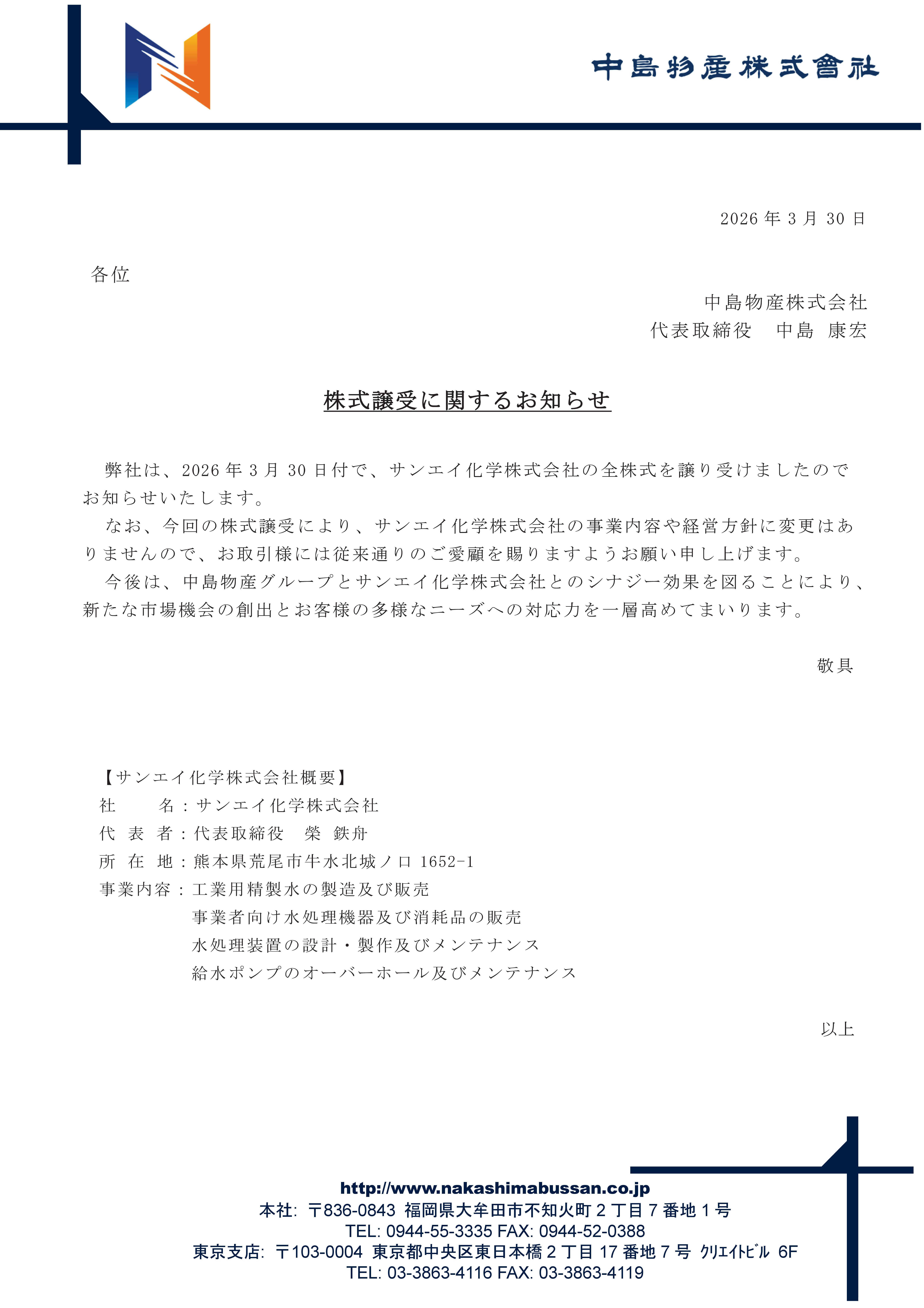 ホーム お知らせ 株式譲受に関するお知らせ 株式譲受に関するお知らせ 2026.03.30 お知らせ 当社は、2026年3月30日付で、サンエイ化学株式会社の全株式を譲り受けました お知らせ一覧へ戻る お問い合わせ Contact 電話でのお問い合わせ 0944-55-3335 メールでお問い合わせ